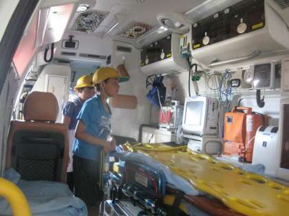 朝から,吉田消防署の見学に行きました。4年生は,初めて救急車の中を見たり,消防自動車の構造を見たりして興味津々でした。熱心にメモをとっていました。
