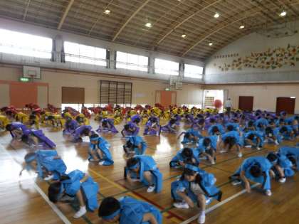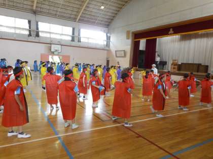 運動会のソーラン節の衣装を着て踊りました。1組は赤,2組は青のはっぴを着ます。練習を重ね,踊りがかっこよくなっています。本番が楽しみです。