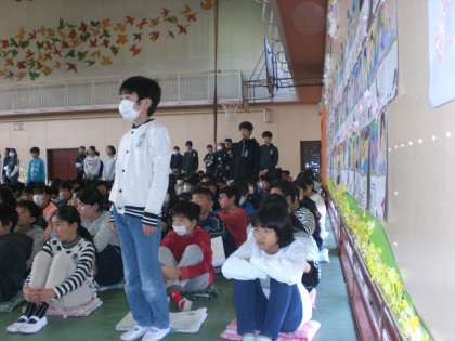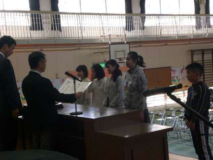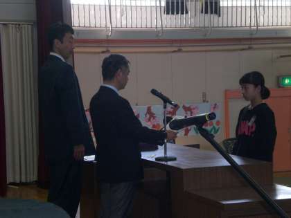 今日は,今年度最後の表彰が行われました。「みんなにすすめたい一冊の本 県知事賞」「漢字検定」「体力優良賞」の表彰が行われました。表彰される人は,全校児童からの拍手を受けて誇らしそうでした。