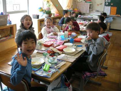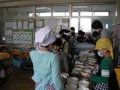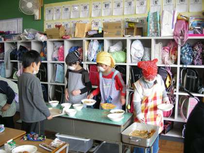 今週来週の給食当番は,エプロンと三角巾を持参します。いつも以上に張り切って準備をしているようです。給食を完食する子が多くなってきました。心も体も元気いっぱいの2年生です。