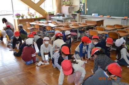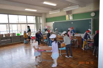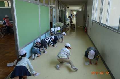 今年もみ・そ・あ・じ名人を目指して,黙働に取り組んでいます。ぞうきんがけは「ワイパー拭き」です。車のワイパーのように手を動かして床を拭きます。みんな頑張っています。