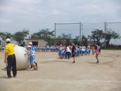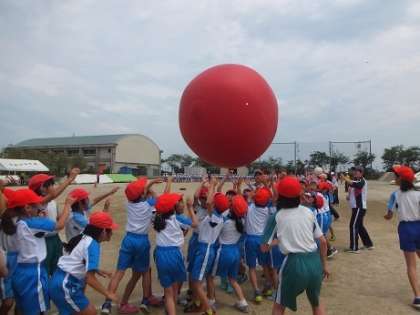 全児童による大玉送りの練習をしました。玉を送ったり転がしたり,とても楽しそうでした。2年生は,2年生団体の種目としても,大玉送りがあります。体より大きな玉を転がしながら走るのは,とても難しく,友達と協力しなければなりません。運動会では,赤と白どちらが勝つでしょうか。