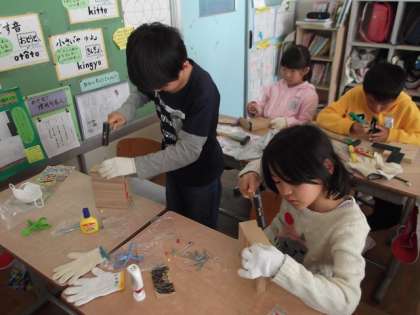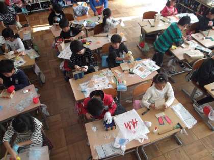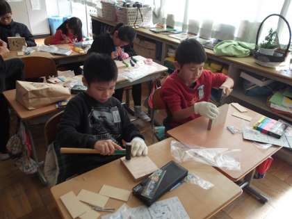 今,図工では「くぎうちトントン」の学習をしています。今日は,金づちを手に,トントンと釘を打っていきました。少しゆるめに打って板が回転するようにしたり,釘をたくさん打って絵のように仕上げたり,工夫をしながら製作していました。初めは,板から釘がとび出たり,斜めに打ってしまっていた児童も,だんだん上手に打てるようになってきました。完成が楽しみです。