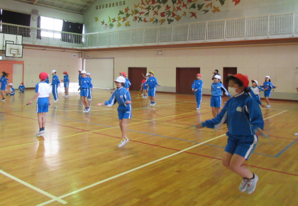体育の学習では,短縄跳びの練習も行っています。3分間の時間跳びに挑戦したり,いろいろな跳び方に挑戦したりしています。今日は後ろ跳びを中心に練習しました。友達と数えあって,1回でも多く記録が伸びることを目指しました。