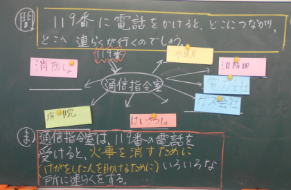 社会では,「火事からくらしを守る」の学習をしています。火事があり,119番の電話をかけると,どこにつながるのかを考えました。消防署だけでなく,様々なところに連絡が行き,火事を早く消す工夫をしていることが分かりました。30日(木)は,吉田消防署見学を予定しています。実際に見て,聞いて,消防署や消防士さんについて学びます。