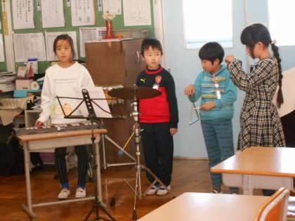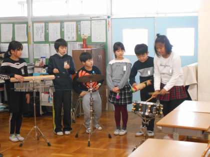 音楽の時間に,ウインドチャイム・鉄琴・シンバル・小太鼓・ギロなどのいろいろな楽器を使って,グループでまほうの音楽を作っています。