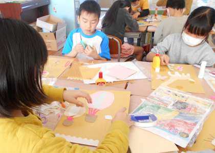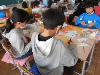 図工の時間に「紙版画」をつくっています。版にいろいろな材料をはっています。仕上がって、写すのが楽しみです。