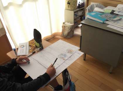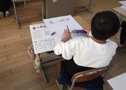 本日2/12(水)の朝の時間に,総合的な学習の時間「心を込めていただきます」で各自が調べたことを画用紙に清書しています。「米の種類」「米作りの歴史」等について調べたことを発表資料にまとめ,情報を発信していきます。