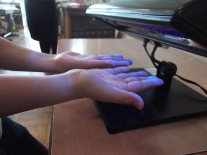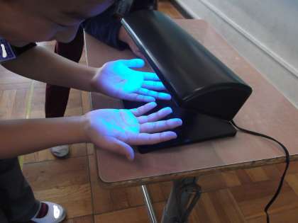 本日2/21(金)の保健の授業で,手洗いチェッカーを使って,3年全クラスが養護教諭と手洗い実験を行いました。