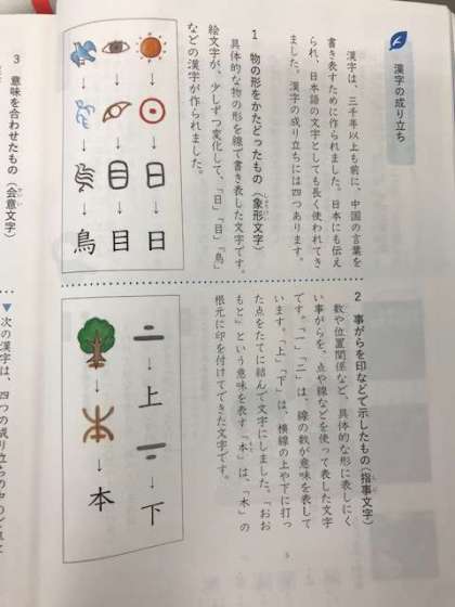 今日は,国語の学習です。漢字の成り立ちには,象形文字,指事文字,会意文字,形声文字の4つの成り立ちがあります。それぞれどんな特徴があるのかを調べてみてください。さて,次の漢字は4つの成り立ちの中のどれに当てはまるでしょう。教科書P44〜45に書いてありますので,見てください。くわしくは授業のときにお話しします。