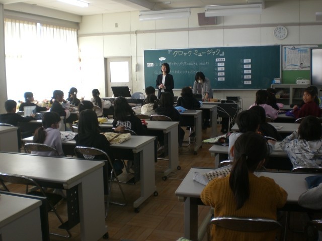 今日は授業参観日です。3年生は、クロックミュージックの発表を行いました。グループになり、秒針の刻むリズムに合わせて、4つの楽器を演奏しました。それぞれのグループで工夫を凝らした合奏が披露されました。