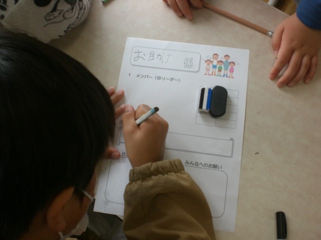 4年生は、学級活動で係活動分担を決めていました。創意工夫を凝らした係活動にするために係のメンバーで頭を寄せ合い話し合っていました。