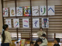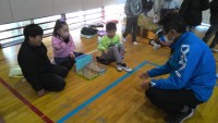今日の体育は、「投げる」動きです。半身になって、体育館の2階ギャラリーめがけて投げ込みます。腕とひじの使い方、体の回し方など、だんだんわかってきたようです。