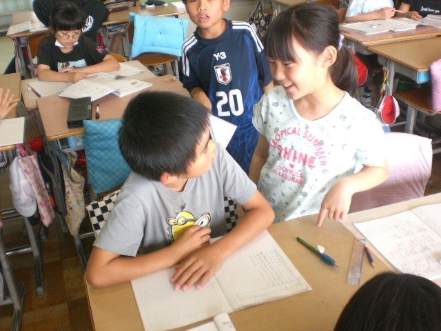 わり算のひっ算。練習問題に取り組みます。互いに相談したり、教え合ったりしながら解き進めることが自然とできるようになりましたね。