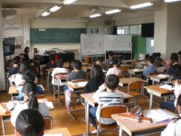 今日は1組と3組の合同の音楽授業です。画面に流れる数字の歌に合わせて、体を使いな...