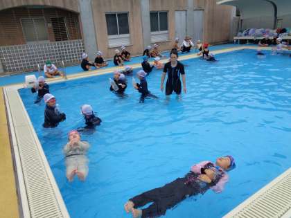 【着衣水泳】2年生 公開日 2024/07/11 更新日 2024/07/11 2年生 子ども達が長袖と長ズボンで浮かんだり、空ペットボットルを抱えって浮かんだりすることにチャレンジできました。「長袖と長ズボンのままで水に入ると、体がおもくなる。」と気づいてくれました。