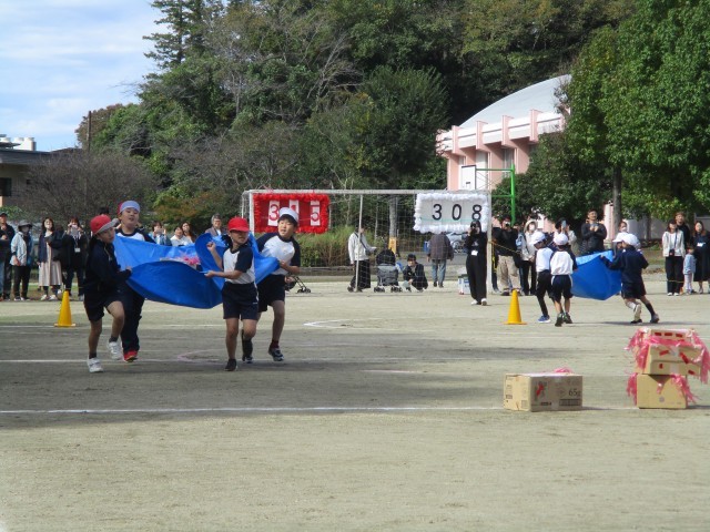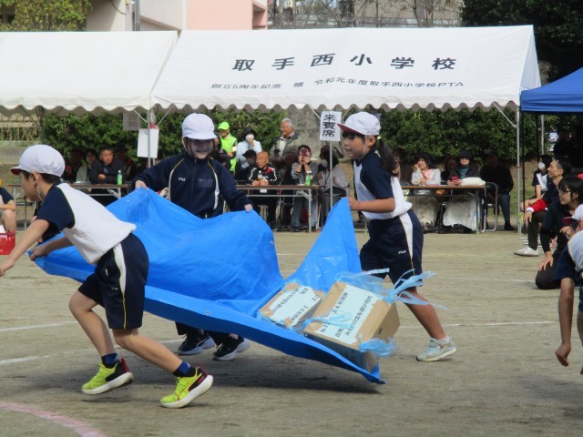 4年生との団体種目(段ボール運びリレー)ではどのチームも協力して頑張りました。