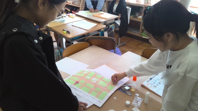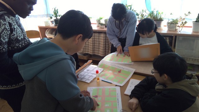 その表現を用いて行ったのは、「オリジナルマップ作りゲーム」です。各チームが、事前にある地点に建物やお店などを設定し、それらについて道を尋ねながら情報を収集していきます。使って良いのは英語のみ!正解するとその場所のカードが貰えて、徐々にマップが完成していきます。時間内にできるだけマップを完成に近づけられるように、夢中でやり取りをしていました。「最初は難しかったけど、友達の説明を聞いてちゃんと場所が分かった!」「正解の場所まで1人で説明できた!」など、これまでの学習の成果を十分に感じていました。