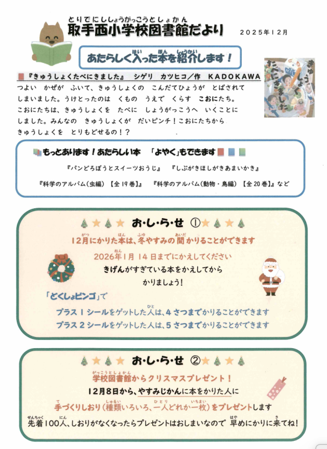 図書だより8 公開日 2025/12/15 更新日 2025/12/15 委員会・クラブ いよいよ冬休みですね。冬休み前に借りると、長く借りられますので、ぜひいつもはなかなか手が出せない長編にも挑戦してみてください。しおりのプレゼントも大人気です! いいね(0)