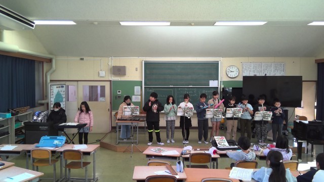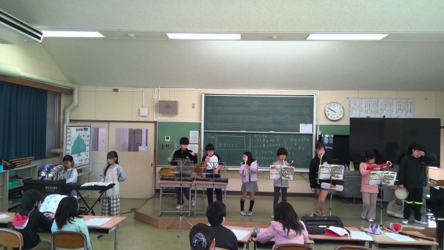 音楽の授業で器楽合奏をしました。リコーダー、鍵盤ハーモニカ、鉄琴、バスマスターなどをそれぞれが担当し、童謡「パフ」を演奏しました。