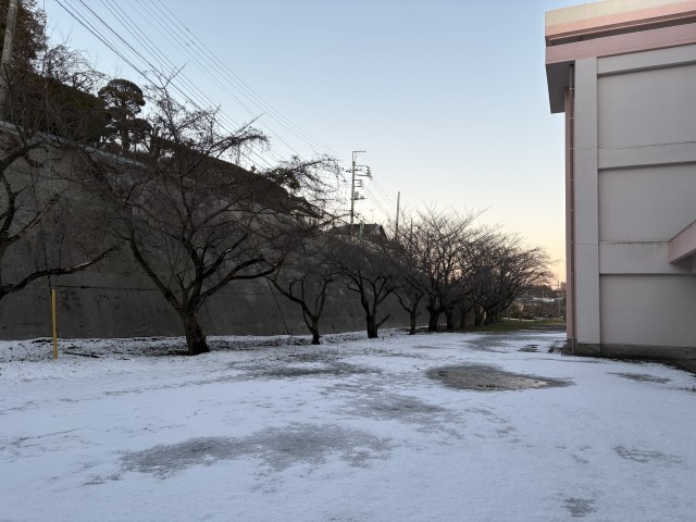 校庭や校舎にはうっすらと雪が積もり、夕方の学校は静かな冬の表情を見せていました。