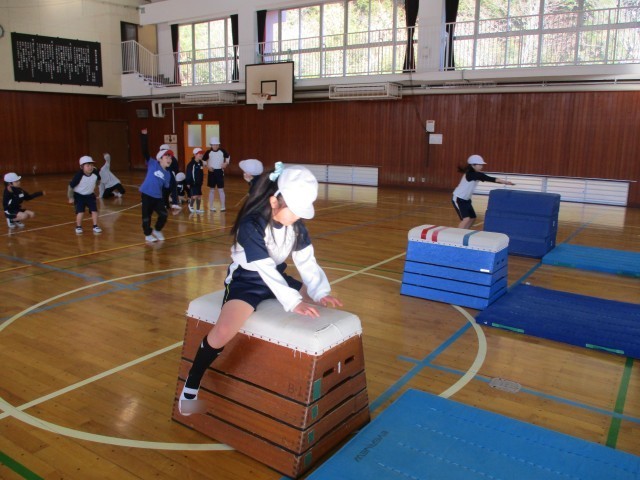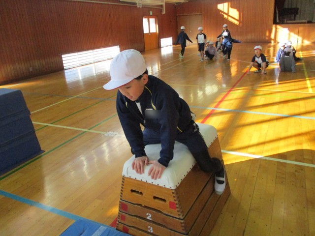 マット運動が終わり、跳び箱が始まりました。マット運動と同じように、手のつく位置や踏み込む足を意識しながら取り組んでいます。