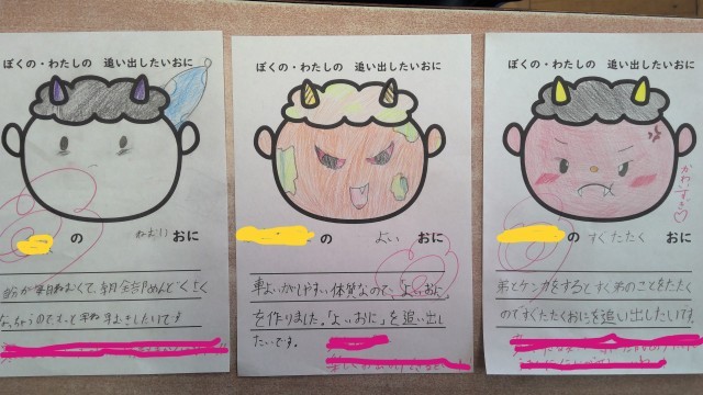 朝のモジュールの時間を活用して、「自分の中から追い出したい鬼」は何か考えました。「面倒くさがり鬼」「眠い鬼」「イライラ鬼」など、自分の普段の生活を振り返って、課題とするところを見つけられたようです。「追い出したい鬼」は追い出して、福がたくさんやってきますように!給食では、恵方を向いてみんなで牛乳を乾杯して飲みました!