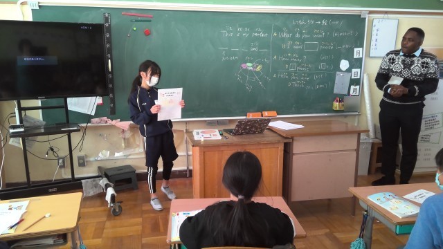 外国語活動では、ほしいものを尋ね合う学習をしています。友達とペアになって、パフェに入れたい果物を尋ね合い、聞き取った内容をイラストで描き表しました。楽しみながら、活動することができました。