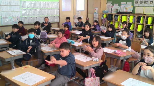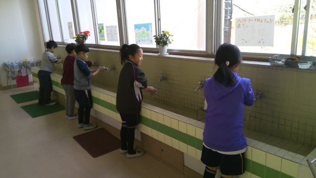1組が2時間目、2組が3時間目に手洗い指導を行いました。養護教諭と一緒に、なぜ手洗いをするのか・どんなところにばい菌がいるのかを考え、正しい手洗いの仕方を学習しました。清潔なハンカチで手を拭くことも大切です。全員手洗いをした後、特殊なライトに照らし、自分の手がきれいになったかを確かめました。白く映る部分は汚れが残っている場所です。「指先が真っ白」「親指だけ白い」など、洗い残しの多さに皆が驚いていました。歌に合わせて洗い方を覚えました。この季節は感染症の流行もあるので、今後も意識して実践できるように声掛けをしていきます。