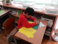 切って、貼って、くっつけて世界に一つのお面ができました。「こんな鬼がいたらいやだな~」といいながら鬼のお面を作ったり、きつねの耳に子ぎつねの絵を書いたりと、作って楽しい見てて楽しいお面がたくさんできあがりました。