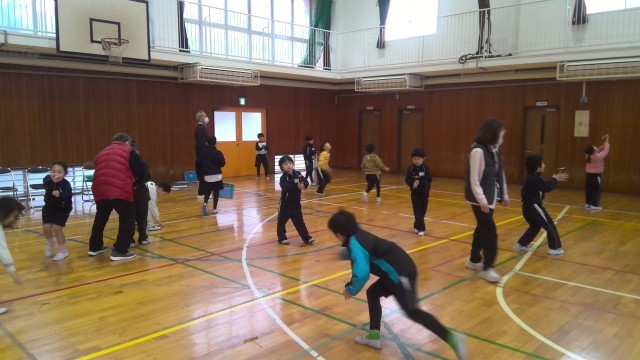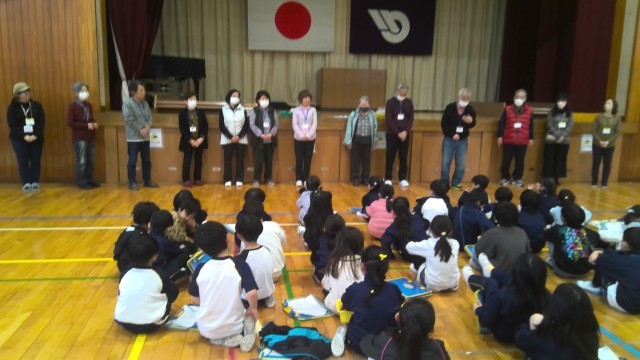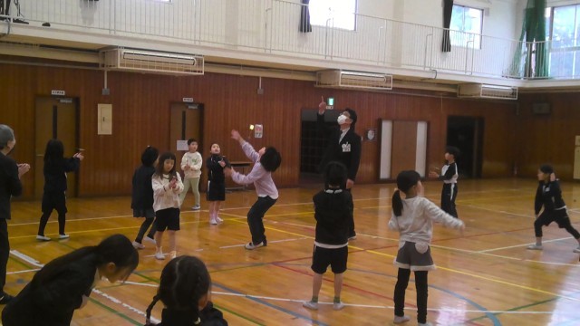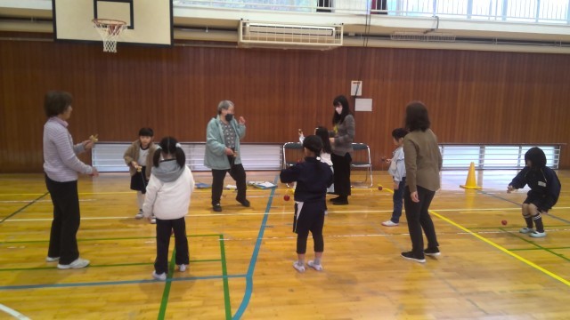 3時間目は場所を体育館に移して、はねつき・こま・竹とんぼ・けん玉の4つのエリアを作り、子供たちは自由に活動しました。むかしのあそび名人さんからコツを聞いて、何度も取り組んでいました。振り返りの時は、「楽しかったです。」「少しできるようになって嬉しいです。」「またすぐ来てください。」など、楽しい嬉しい活動ができました。