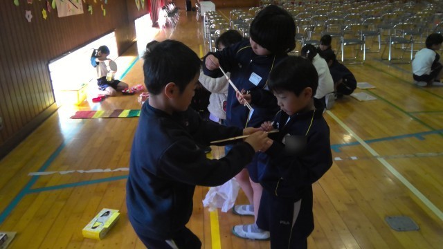 優しく丁寧に教える姿が見られました。「上手だね!」「すごいね」など声をかけたり、お手本を見せたりするなど立派なお兄さん、お姉さんでした。