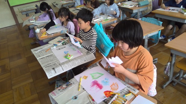 待ちに待った図工の時間。クレヨンを使ったこすり出し技法にチャレンジ。「わぁ。色がきれい。○○ちゃんすごーい。」などとみんな大盛り上がり。しっかり2時間で完成することができました。授業参観の際に廊下掲示していますのでお楽しみに!