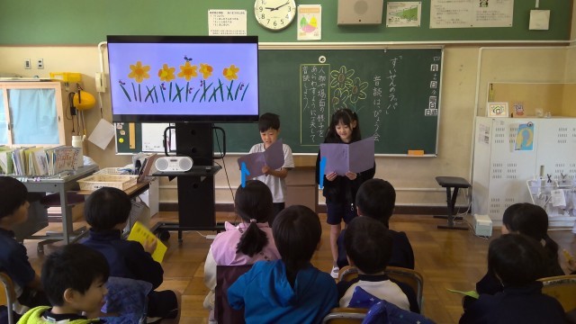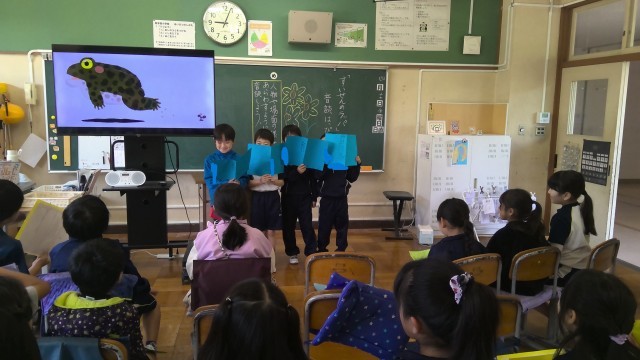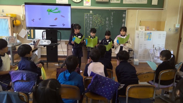今日は、「すいせんのラッパ」の音読発表会本番です。前半の練習時間には、「あと1回だけ!!」とギリギリまで工夫を凝らした音読発表になる様、一生懸命練習している姿が見られました。本番の発表では、登場するカエルに合わせて声色を工夫したり、強調したいところをみんなで声を揃えて読んだり、ジェスチャーまで交えて音読するグループも!どのグループの発表も生き生きとしていました。