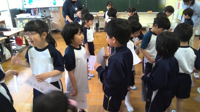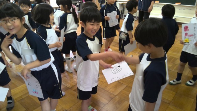 1年生 国語 よろしくね! 公開日 2026/04/23 更新日 2026/04/23 1年生 学年で集まって、「よろしくねの会」をやりました。自己紹介カードを持って友達のところへ行き挨拶をします。名前を言い、好きな事を伝え、握手をします。そして、また次の友達のところへ行って、挨拶から始めます。違うクラスの友達の名前もたくさん覚えられました。 +4 いいね(0)