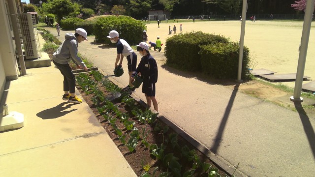 取手西小学校は自然豊かな学校です。休み時間になると、栽培委員がお花に水を上げて、元気いっぱいの花壇にしています。草や茂みの中には、バッタやとかげなども顔を出し始め、子供たちは植物や虫の観察に夢中になっています。上級生が赤色帽子の1年生と一緒に遊ぶ姿もたくさん見られます。あらゆるところで笑顔があふれている休み時間の様子です。