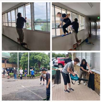 残った時間は廊下の窓ガラス拭きを行いました。蒸し暑い中の作業、お疲れ様でした。おかげさまでエアコンの効きが改善され省エネにもなること間違いなさそうです。