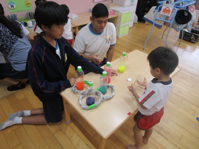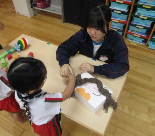 生徒たちは、それぞれのクラスの幼児の年齢に合わせて手作りしたおもちゃを持参し、一緒に楽しい時間を過ごしました。
