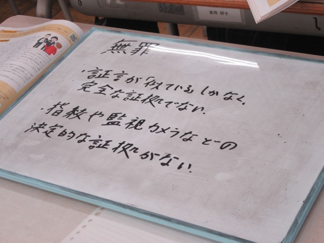 生徒たちは、事例について、被告人が有罪なのか無罪なのか、また、その根拠についてグループごとに考え、まとめていました。