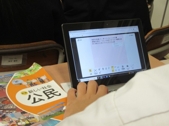 本校の研究テーマは、『生徒が思考できる学習の充実 ~学びたくなる導入と思考が深まる協働場面の工夫~』。