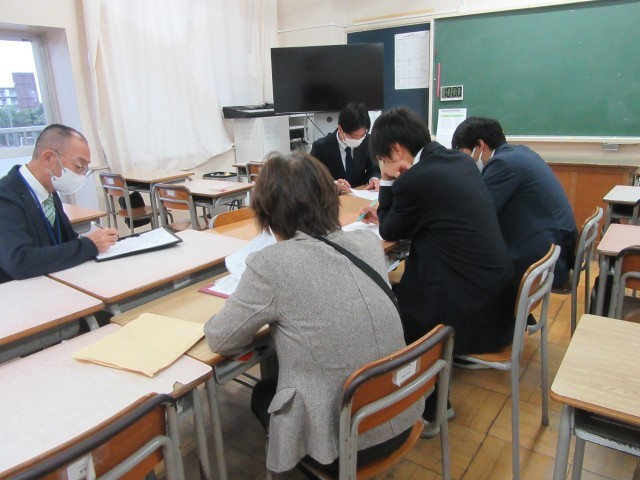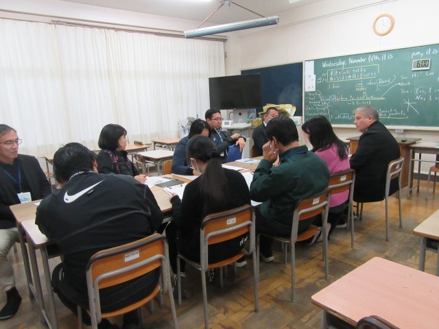 授業後の振り返りでは、「生徒が学びたくなる導入の工夫」「思考が深まる協働場面の工夫」「評価方法と評価基準は適切さ」を視点に協議が行われました。
