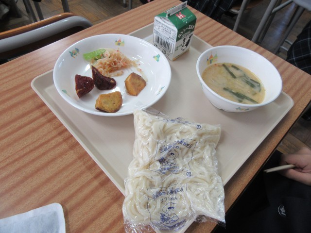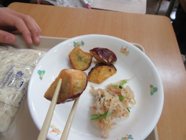 今日の給食は、ソフト麺、ごま豆乳汁、かにかまあえ、大学いも、牛乳でした。