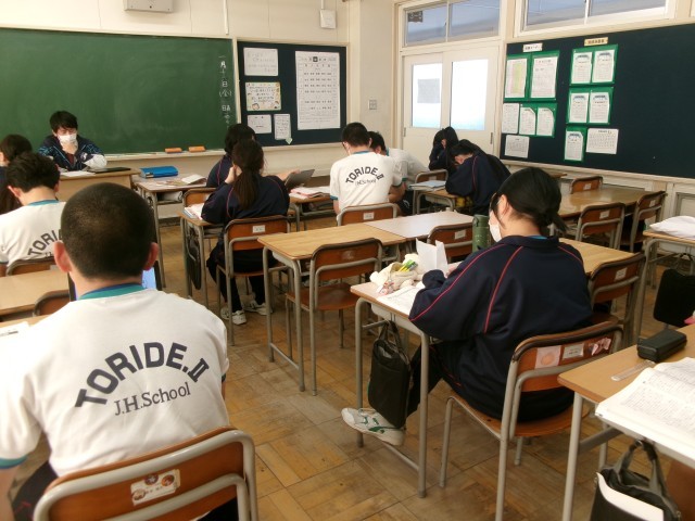 3年生の教室では、自分の目標とする進路に向け、一生懸命に頑張っている生徒たちの様子が見られます。