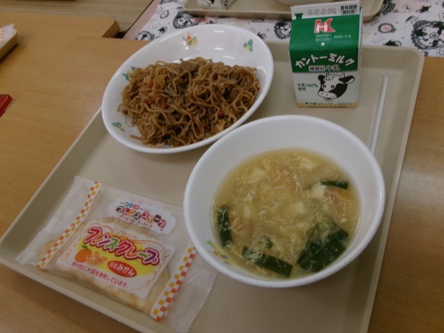 今日の給食は、ソース焼きそば、にら玉スープ、クレープ、牛乳でした。