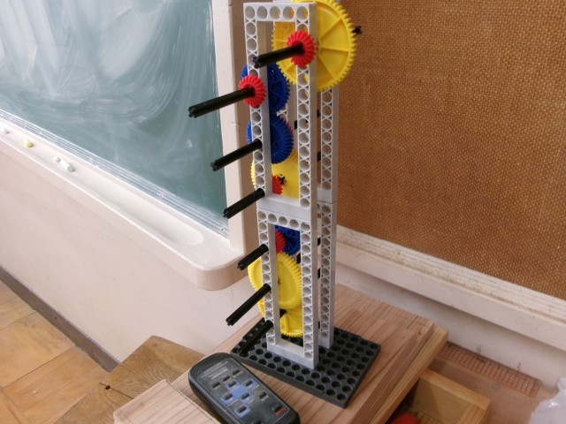 そのままでは水を入れたペットボトルを持ちあげることはできません。どのようにギアを組み合わせたら効率的に力を出せるのかをグループで考え、実験をしながら考えました。
