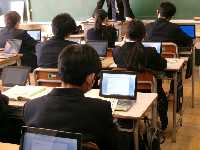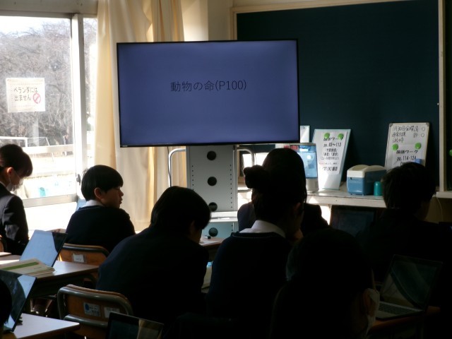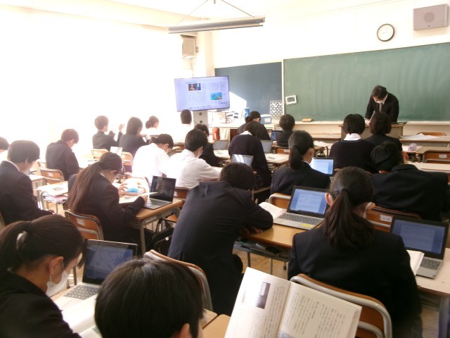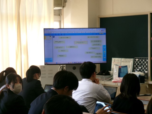 タブレット端末を活用し、生徒たちが考えや思いを入力し、交流するような場面が見られました。
