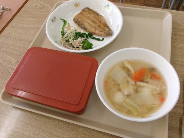 メニューは、イワシのかば焼き、菜の花と豚肉のからしあえ、だまこのみそ汁、ご飯、牛乳でした。
