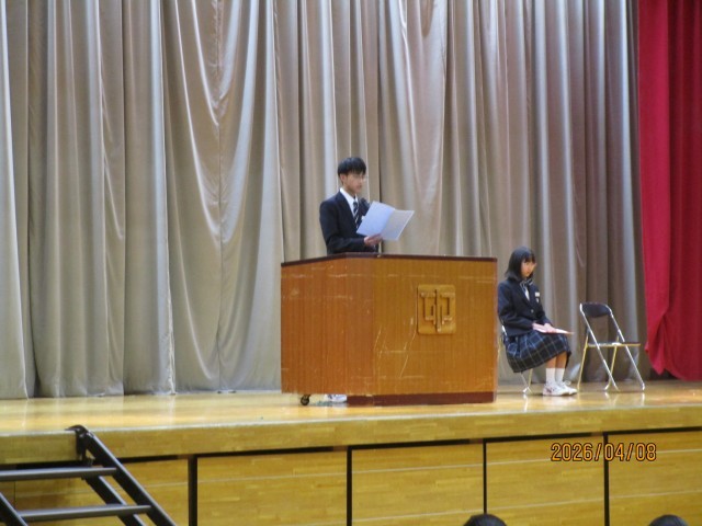 代表生徒のすばらしい発表があり、今年1年間の抱負が語られました。