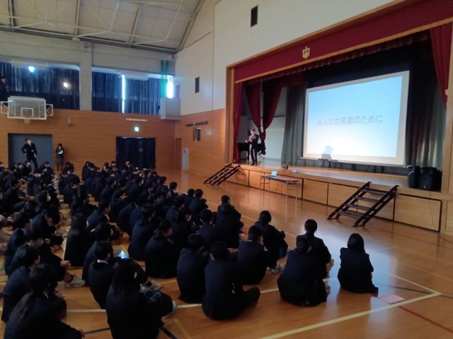 また、校長の式辞はプレゼン方式で行われ、「みんなの笑顔のために」という合言葉を生徒、先生、全員で誓い合いました。