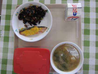 麦ごはん・牛乳・さけの黄金焼き・ひじきの炒め煮・豚汁